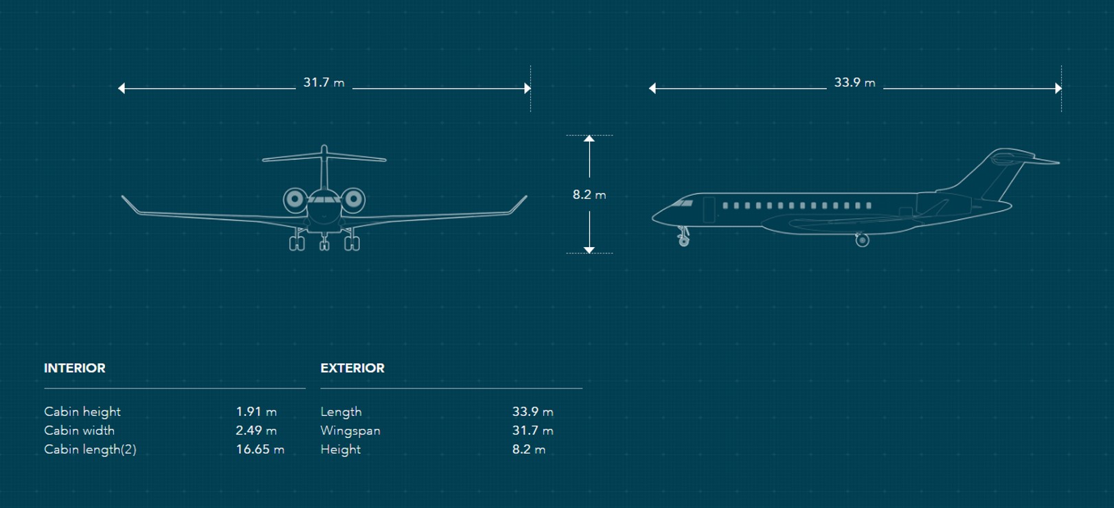 Le design extérieur du jet est tout aussi visionnaire et peut compter sur une conception des ailes que la compagnie décrit comme étant « pensée pour optimiser la vitesse, la portée et le contrôle et à même d’assurer un vol confortable en douceur. » Sa capacité de longue portée s’étend sur 13 705 km. Bombardier fait d’ailleurs remarquer que cette portée équivaut à la distance entre Londres et Singapour ou New York et Dubaï. L’avionneur présente les spécifications complètes ici.